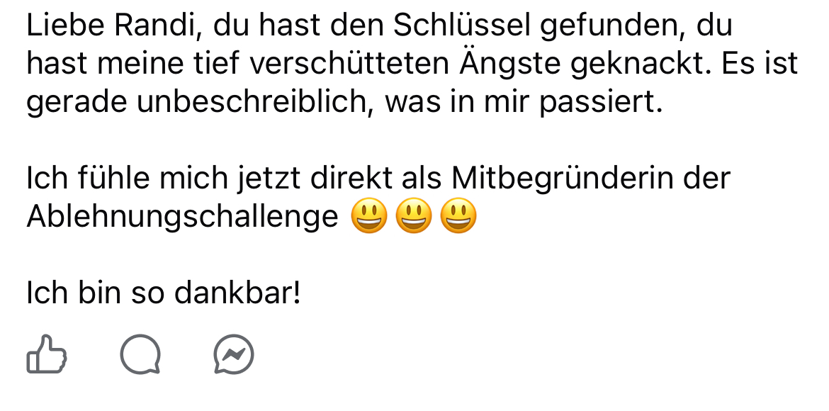 Daher habe ich die AblehnungsChallenge ins Leben gerufen, wo wir gemeinsam trainieren, die Angst vor Ablehnung zu lösen, proaktiv in mögliche Ablehnung hineinzuhandeln und uns daran zu ermächtigen.